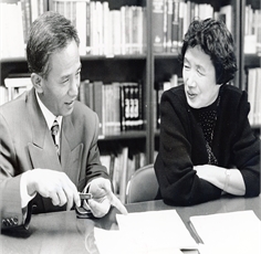 박완서·김홍신 작가가 1993년 12월 27일 본지가 주최한 제1회 신춘평화문학상 응모작을 심사하며 대화하고 있다. 가톨릭평화신문 DB 작품 속 음식 통해