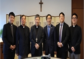 천주교 서울대교구장 정순택 대주교가 3일 오후, 전성환 대통령실 경청통합수석을 만나 기념사진을 찍고 있다. 왼쪽부터 서울대교구 문화홍보국장 김남균 신부, 사무처장 정성환 신부,