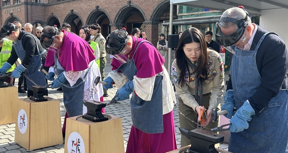 2027 서울 세계청년대회 조직위원장 정순택 대주교와 총괄 코디네이터 이경상 주교도 보호장구를 착용하고 망치를 들었습니다.