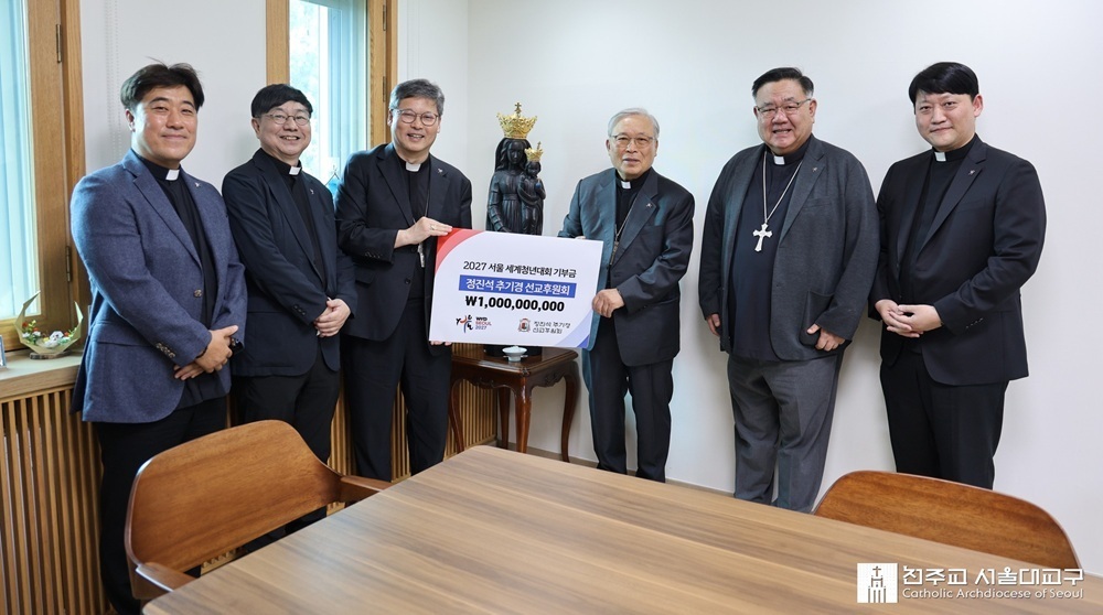 4월 29일 서울 혜화동 주교관에서 열린 기부금 전달식엔 정 대주교를 비롯해 2027 서울 세계청년대회 조직위원회 총괄 코디네이터 이경상 주교, 사무총장 김남균 신부, 정진석 추기경 선교후원회 이사장 허영엽 신부 등이 참석했습니다.