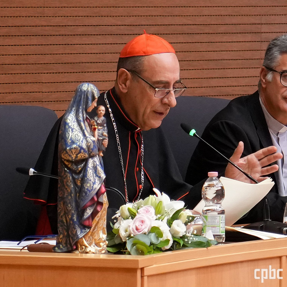 교황청 신앙교리부 장관 빅토르 마누엘 페르난데스 추기경이 4일 로마 예수회 본부에서 공지 「충실한 백성의 어머니」(Mater populi fidelis)를 발표하고 있다. OSV
