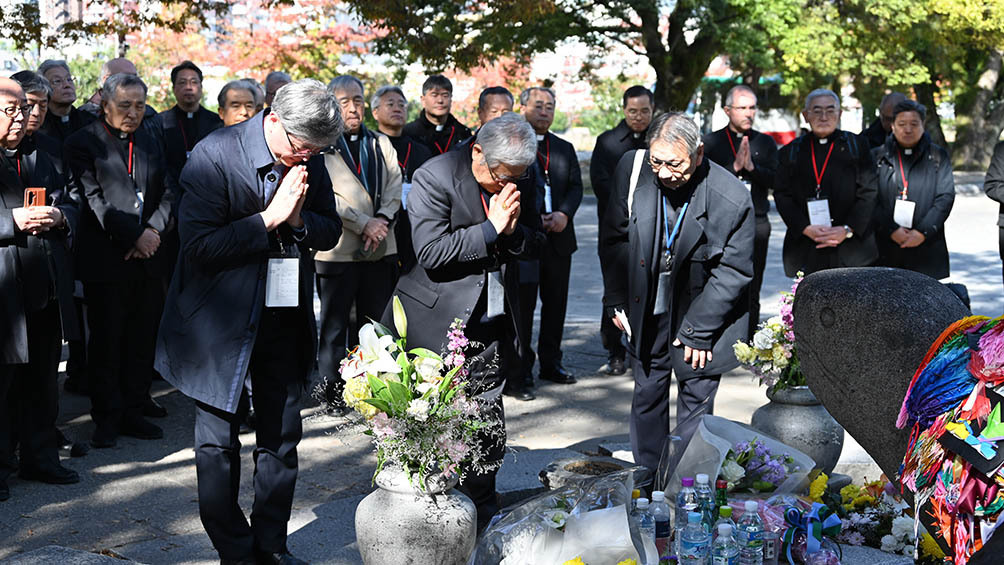 주교단 대표로 옥현진 대주교와 우에무라 마사히로(일본 주교회의 부의장) 주교가 헌화하고, 주교들은 1945년 8월 6일 원폭 투하로 희생된 한국인을 위해 고개 숙여 기도했다. 한국 주교들은 주모경을 바친 뒤 ‘고향의 봄’과 성가 ‘나는 부활이요 생명이니라’를 부르며 추모했다.