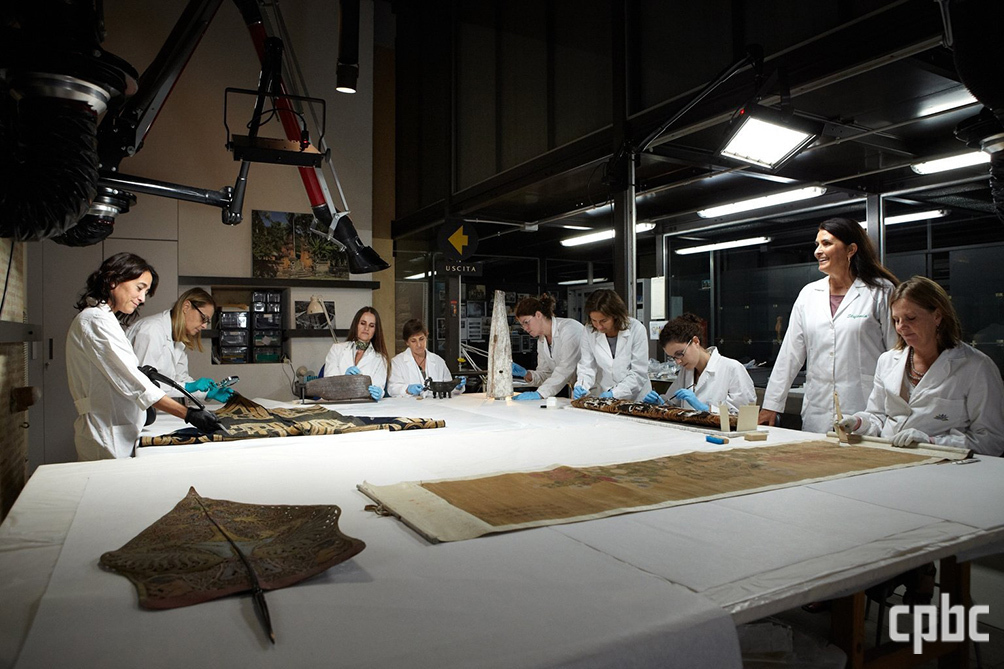 문화재 복원 전문가들이 실험실에서 유물 복원을 하며 대화하고 있다. OSV