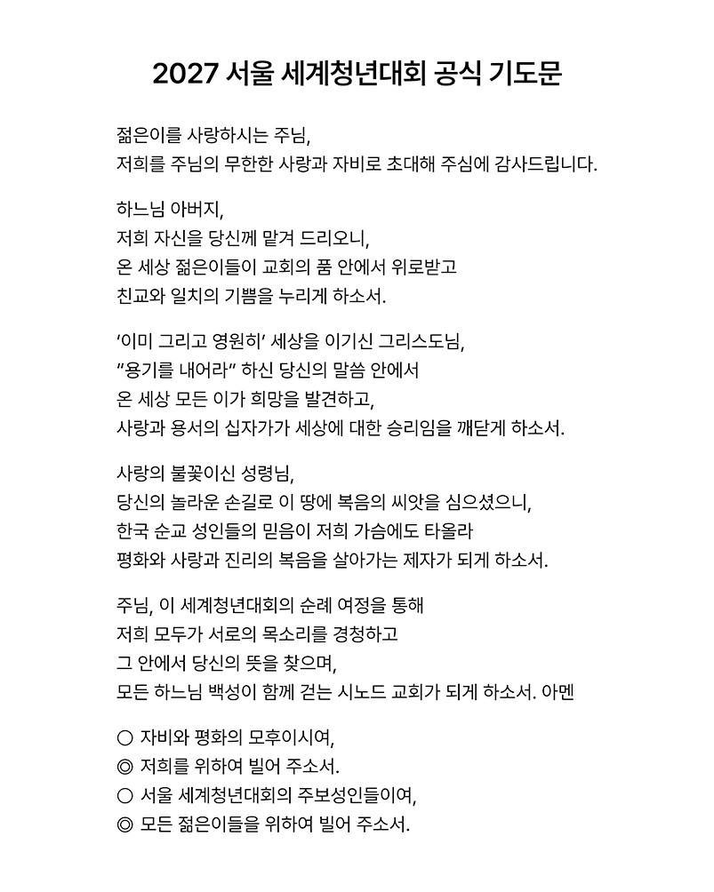 2027 서울 세계청년대회 조직위원회(LOC, 이하 조직위)는 제40차 세계 젊은이의 날인 23일 2027 서울 세계청년대회(World Youth Day, WYD) 공식 기도문을 발표했다. 앞으로 전 세계 교회가 2027 서울 세계청년대회를 준비하며 함께 바치게 될 공식 기도문이다. 조직위는 교황청 평신도가정생명부(DLFL)와 함께 검토·조율해 기도문을 확정했다.