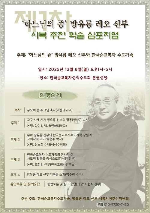 한국순교복자수도가족과 방유룡 레오 사제 시복시성추진위원회가 개최하는 이날 심포지엄은 '하느님의 종 방유룡 레오 신부와 한국순교복자 수도가족'을 주제로 진행된다.