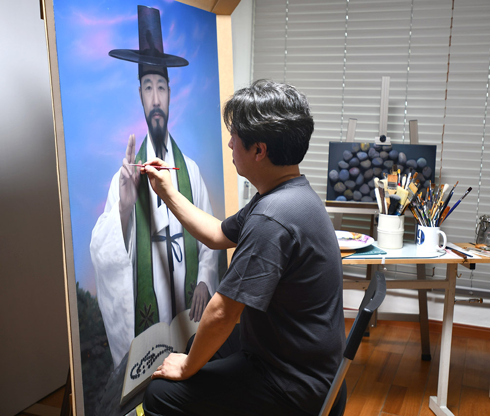 현실주의 회화의 권위자인 김세중(빈첸시오) 작가가 작업실에서 가경자 최양업 신부의 실제 얼굴을 표현해낸 새 초상화를 그리고 있다.