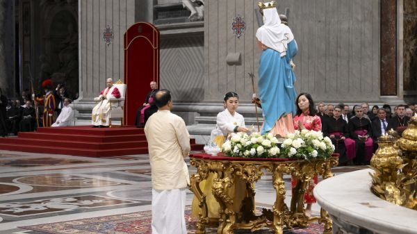 2026년 4월 11일, 레오 14세 교황이 바티칸 성 베드로 대성전에서 열린 평화를 위한 밤샘 기도와 묵주기도 중, 한복을 입은 한국 신자 등 아시아 여러 나라를 상징하는 옷을 입은 신자들이 평화의 모후 성모상 아래에 불을 밝히고 있다. OSV