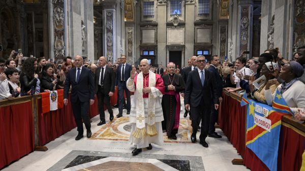 2026년 4월 11일, 바티칸 성 베드로 대성전에서 평화를 위한 묵주기도 후, 레오 14세 교황이 신자들에게 손을 흔들고 있다. OSV