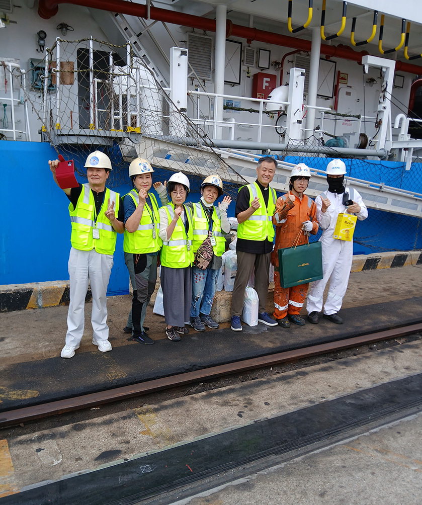 부산교구 해양사목 관계자들과 선원들이 선박 앞에서 환하게 웃고 있다. 손지호 신부 제공