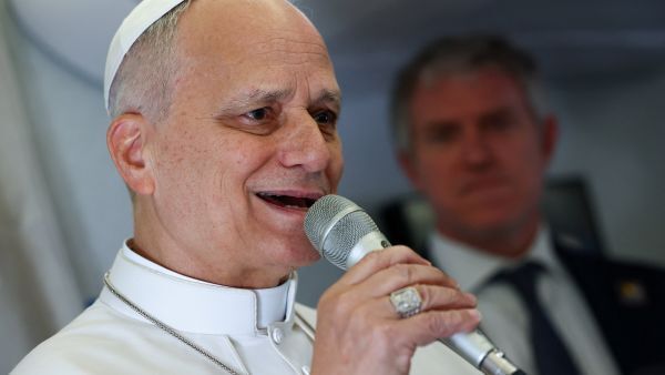 레오 14세 교황이 아프리카 사도 순방의 일환으로 2026년 4월 15일 카메룬 야운데로 향하는 교황 전용기 안에서 언론인들에게 연설하고 있다. OSV