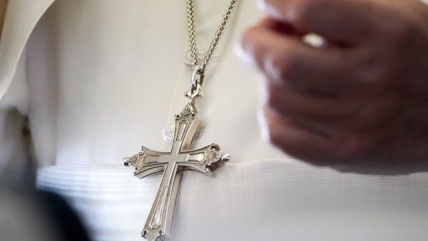 2026년 4월 15일, 알제리에서 카메룬 야운데로 향하는 교황 전용기 안에서 언론인들에게 연설하는 레오 14세 교황의 가슴 십자가 클로즈업. OSV