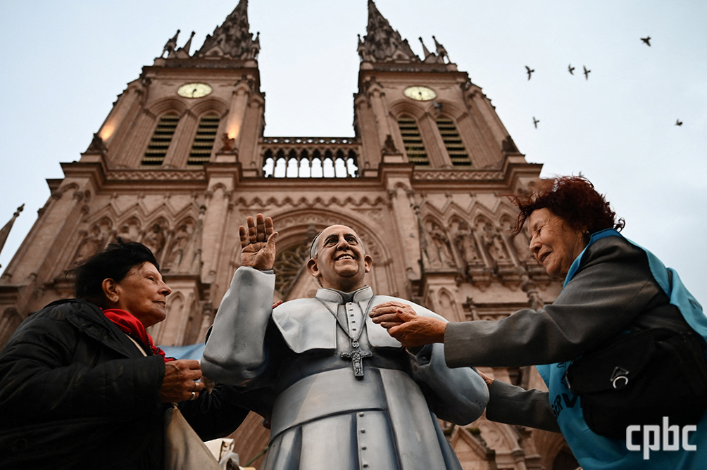 프란치스코 교황의 선종 1주기를 맞은 4월 21일 아르헨티나 루한 성모 대성당 앞에 세워진 프란치스코 교황의 동상 앞에서 신자들이 기도하고 있다. OSV