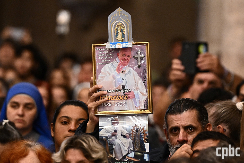 4월 21일 아르헨티나 루한 성모 대성당에서 봉헌된 프란치스코 교황 선종 1주기 추모 미사에 참석한 한 신자가 교황의 초상화를 들어 보이고 있다. OSV