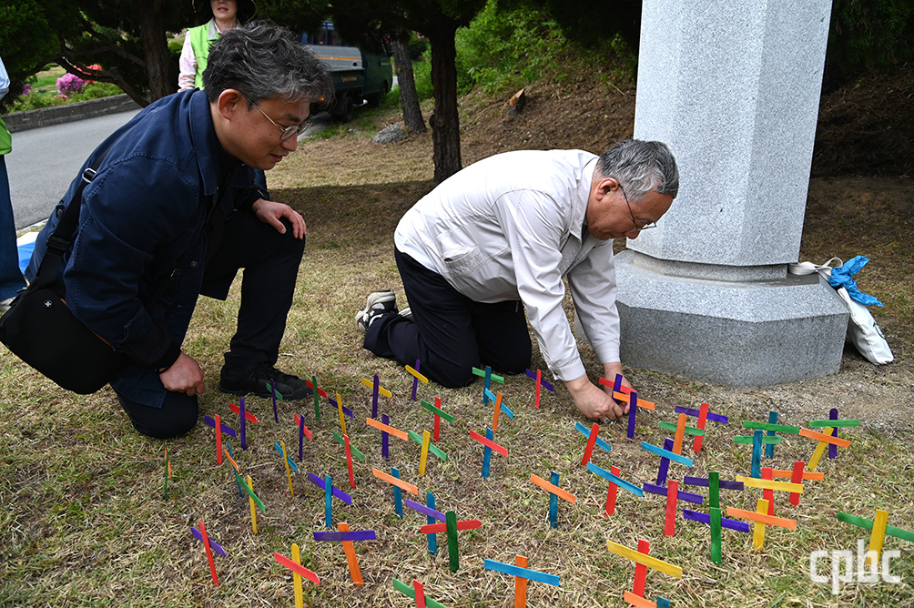 가톨릭생명윤리자문위원회 위원장이자 서울대교구 총대리 구요비 주교가 4월 27일 경기도 용인 천주교 공원묘원 내 낙태아의 묘 ‘라헬의 땅’을 찾아 아기의 이름이 적힌 십자가를 봉헌하고 있다.