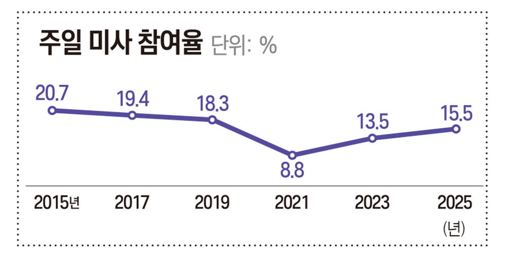 현장 지표도 완전한 회복과는 거리가 있다. 주일 미사 참여율은 15.5로 전년보다 소폭 올랐지만, 교적 신자 600만 명 가운데 84 이상이 여전히 미사에 나오지 않는다는 뜻이기도 하다. 코로나19 이전 수준을 회복한 성사는 병자성사(101.7)뿐이다. 나머지 성사들은 80 안팎에서 회복이 멈춰 있다.
