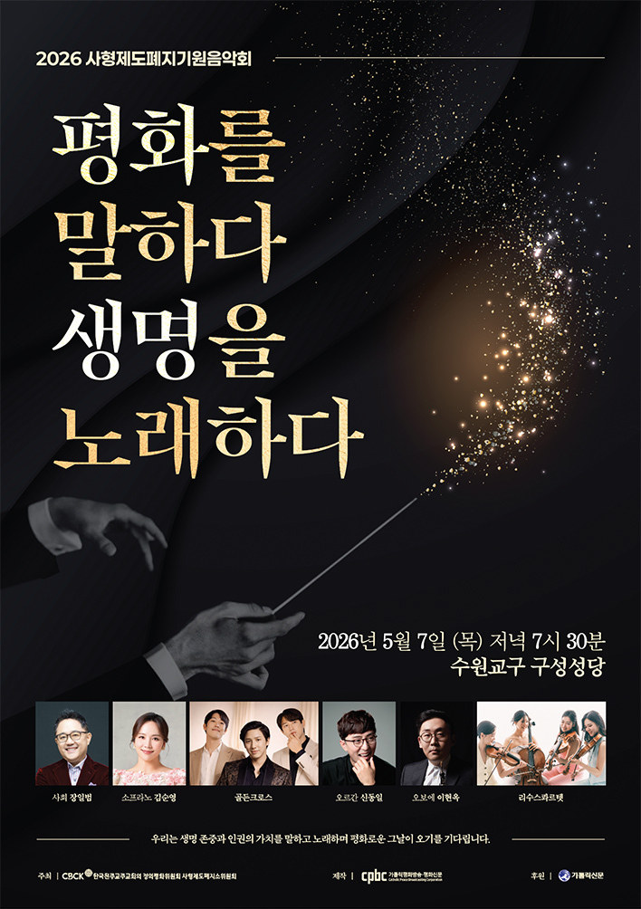 주교회의 정의평화위원회(위원장 김주영 주교) 사형제도폐지소위원회는 5월 7일 오후 7시 30분 수원교구 구성성당(경기 용인 기흥구 마북동)에서 사형제도 폐지 기원 음악회를 개최한다. 이번 음악회는 사형제도 폐지에 대한 인식 개선과 생명 존중의 가치 확산을 위해 위원회와 cpbc 가톨릭평화방송이 공동 기획·제작했다.