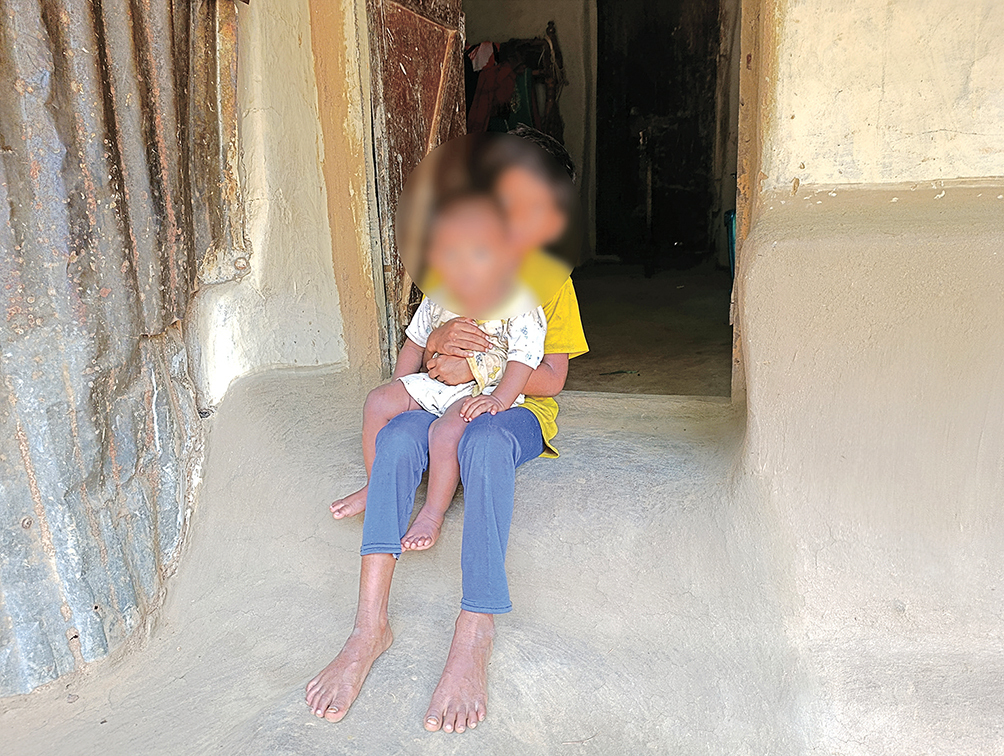 부모가 집을 비운 낮 동안 홀로 여동생 두 명(2살, 3살)을 돌보고 있는 7살 바르날리양.