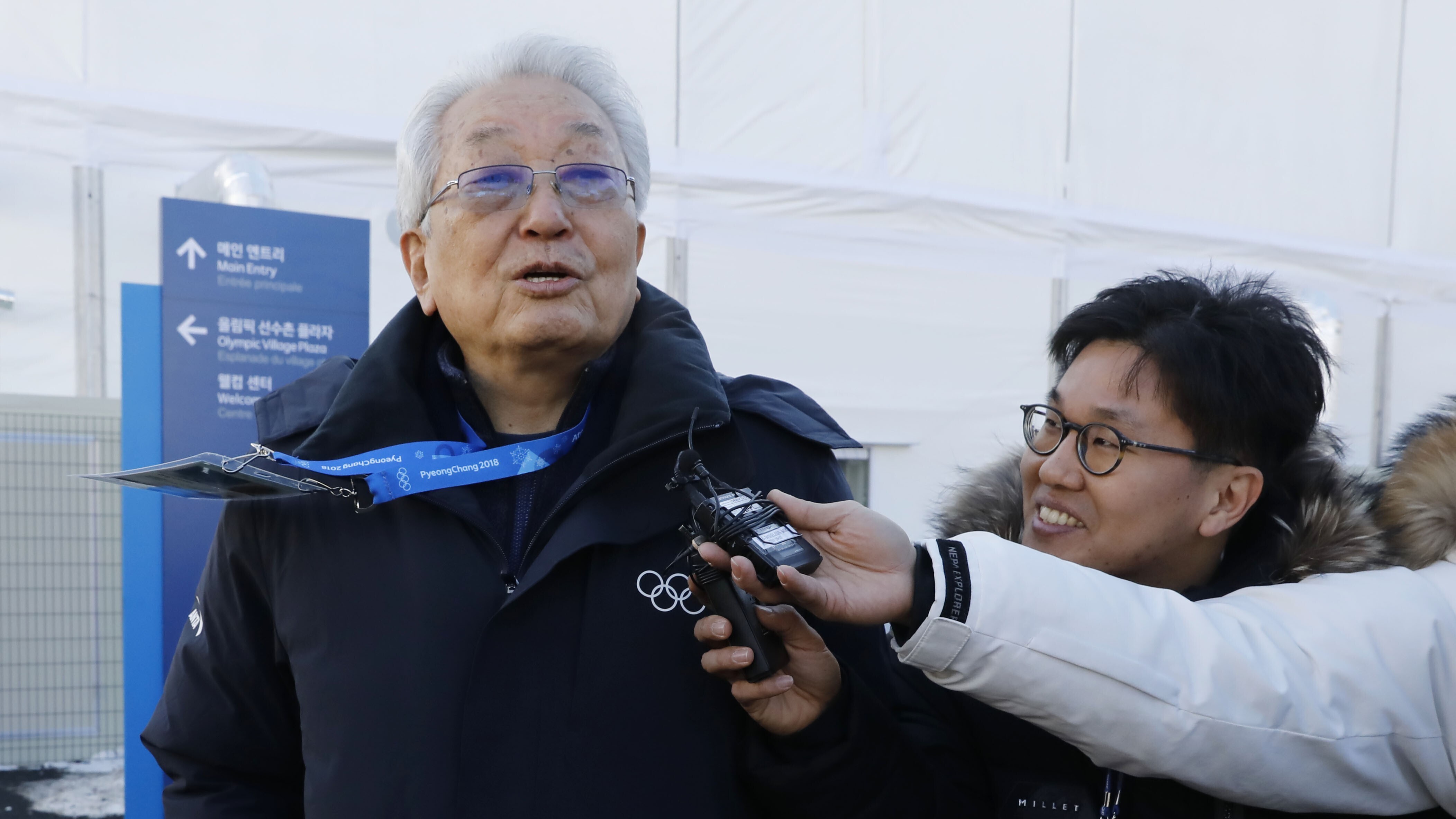 2018년 2월 5일 강원 평창선수촌 라이브사이트 무대에서 열린 평창올림픽 휴전벽 제막식에서 장웅 북한 IOC 위원이 참석하던 중 한국 취재진 질문에 답변하고 있다. 뉴시스