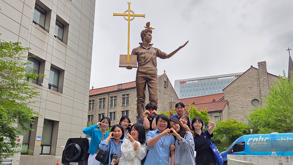 cpbcU-망주들이 4월 27일 서울 cpbc가톨릭평화방송 본사 마당에 설치된 카를로 아쿠티스 성상 앞에서 기념촬영하고 있다.