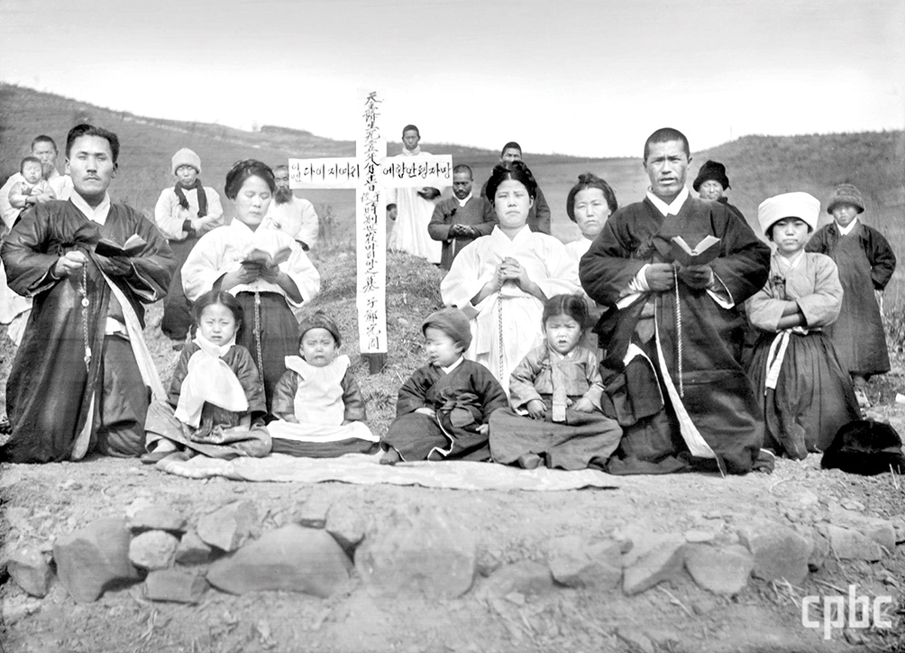 <사진 2> 팔도구 최 마티아 가족의 위령 기도, 유리건판, 1924년 이후, 국외소재문화유산재단, 독일 상트 오틸리엔 수도원 아카이브 소장 한국 사진.