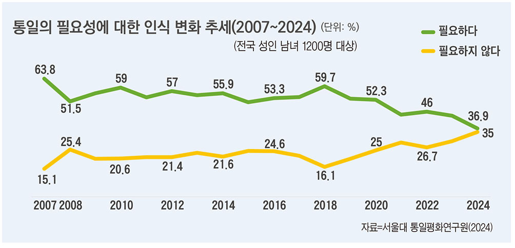 서울대 통일평화연구원이 매년 실시하는 ‘통일의식조사’에 따르면, 국민의 통일 인식은 점차 부정적으로 변하는 추세다. 2024년 당시 ‘남북통일이 필요하다’고 응답한 비율은 36.9로 역대 최저치를, ‘필요하지 않다’고 응답한 비율은 35로 역대 최고치를 기록했다.
