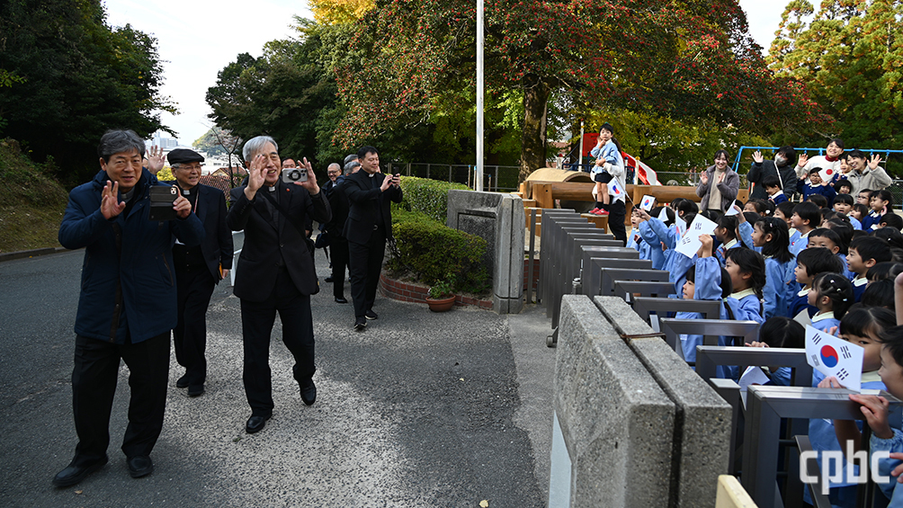 야마구치 천사유치원 아이들이 주교들을 향해 태극기를 흔들며 “안녕하세요”라고 인사하고 있다.