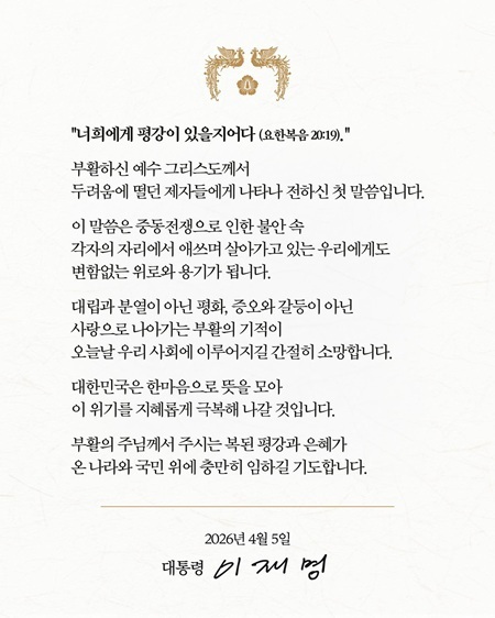 이재명 대통령은 5일 부활절을 맞아 "대립과 분열이 아닌 평화, 증오와 갈등이 아닌 사랑으로 나아가는 부활의 기적이 오늘날 우리 사회에 이루어지길 소망한다"고 밝혔다.
