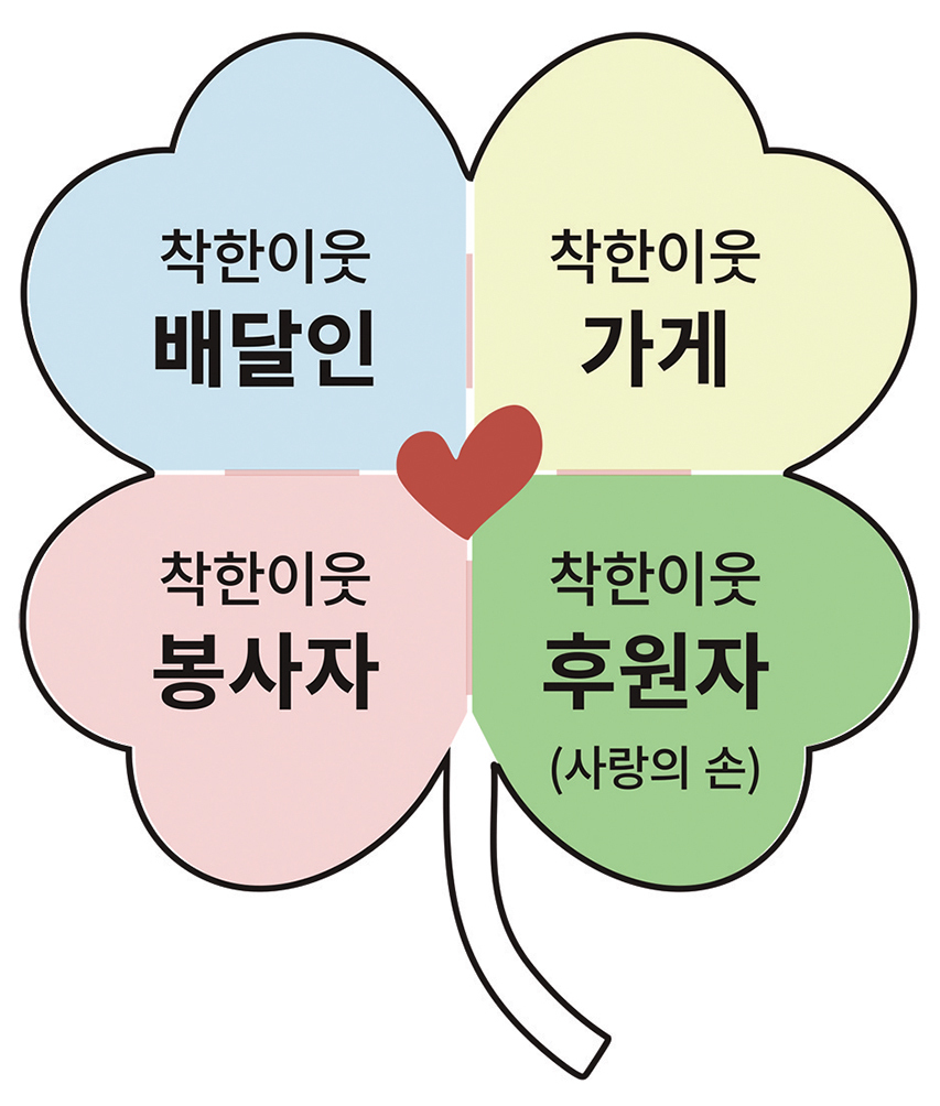 ‘착한이웃’의 핵심은 배달인·가게·봉사자·후원자라는 네 그룹이 이루는 수평적 관계에 있다. 일방적으로 주기만 한다거나, 받기만 하는 사람은 없다.