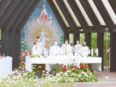 ▲ 춘천교구장 김주영 주교와 원주교구장 조규만 주교를 비롯한 사제단이 3일 제98차 풍수원성체현양대회 미사를 공동 집전하고 있다.춘천교구 문화홍보국 제공 원주ㆍ춘천교구, 인천교구는 지극히 거룩하신