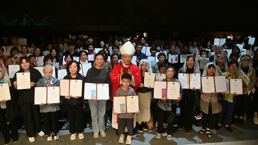 서울대교구 총대리 겸 순교자현양위원회 위원장 구요비 주교가 '순교자 성월을 닫는 미사'에서 축복장을 받은 천주교 서울 순례길 완주자들과 기념 사진을 찍고 있다.