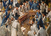 1785년 3월 어느 날 명례방 장악원 앞 김범우의 집에서 신앙 모임을 갖고 있는 초기 조선 교회 그리스도인들이 형조 금리들에게 체포되고 있다. 구글 제미나이 제작 초기