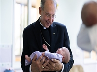 미국 주교회의 부의장 윌리엄 로리 대주교가 4일 베들레헴의 성 가정 어린이집에서 아이를 안고 밝게 미소짓고 있다. OSV 이스라엘의 카타르 공습 이후 중동 지역 정세가