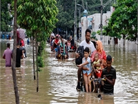 방글라데시 다카에서 지난해 7월 12일 폭우로 침수된 도로를 따라 사람들이 인력거를 타고 이동하고 있다. 남아시아 해안 국가인 방글라데시는 전 세계 재난 위험 국가 중 9위에