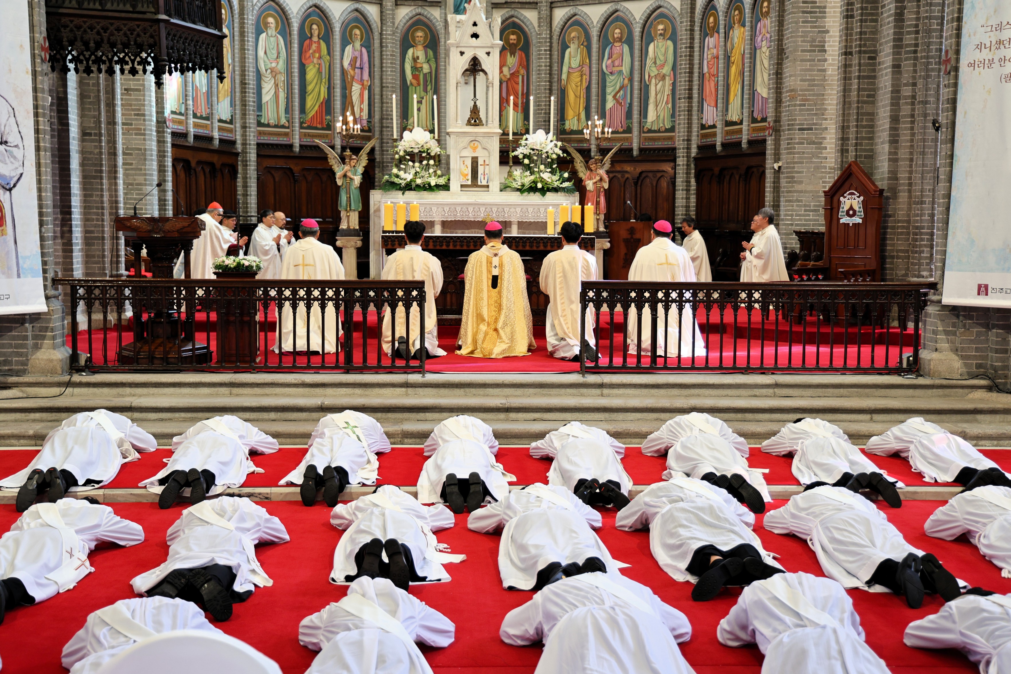 △ 2025년 2월 명동대성당에서 열린 천주교 서울대교구 사제 서품식에서 사제 수품자들이 부복하고 있다. 천주교 서울대교구(교구장 정순택 대주교)는 내달