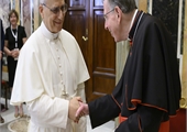 6월 7일 바티칸 사도궁에서 열린 컨퍼런스에 참석한 자리에서 레오 14세 교황과 악수하고 있는 쿠르트 코흐 추기경. OSV ACN 신임 재단장 코르트 코흐 추기경.