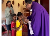 한국외방선교회 윤대호 신부가 2025년 재의 수요일 캄보디아의 쁘렉쁘로마을 아이들의 이마에 재를 바르고 있다. 윤대호 신부 제공 외양간에서 태어난 아기 예
