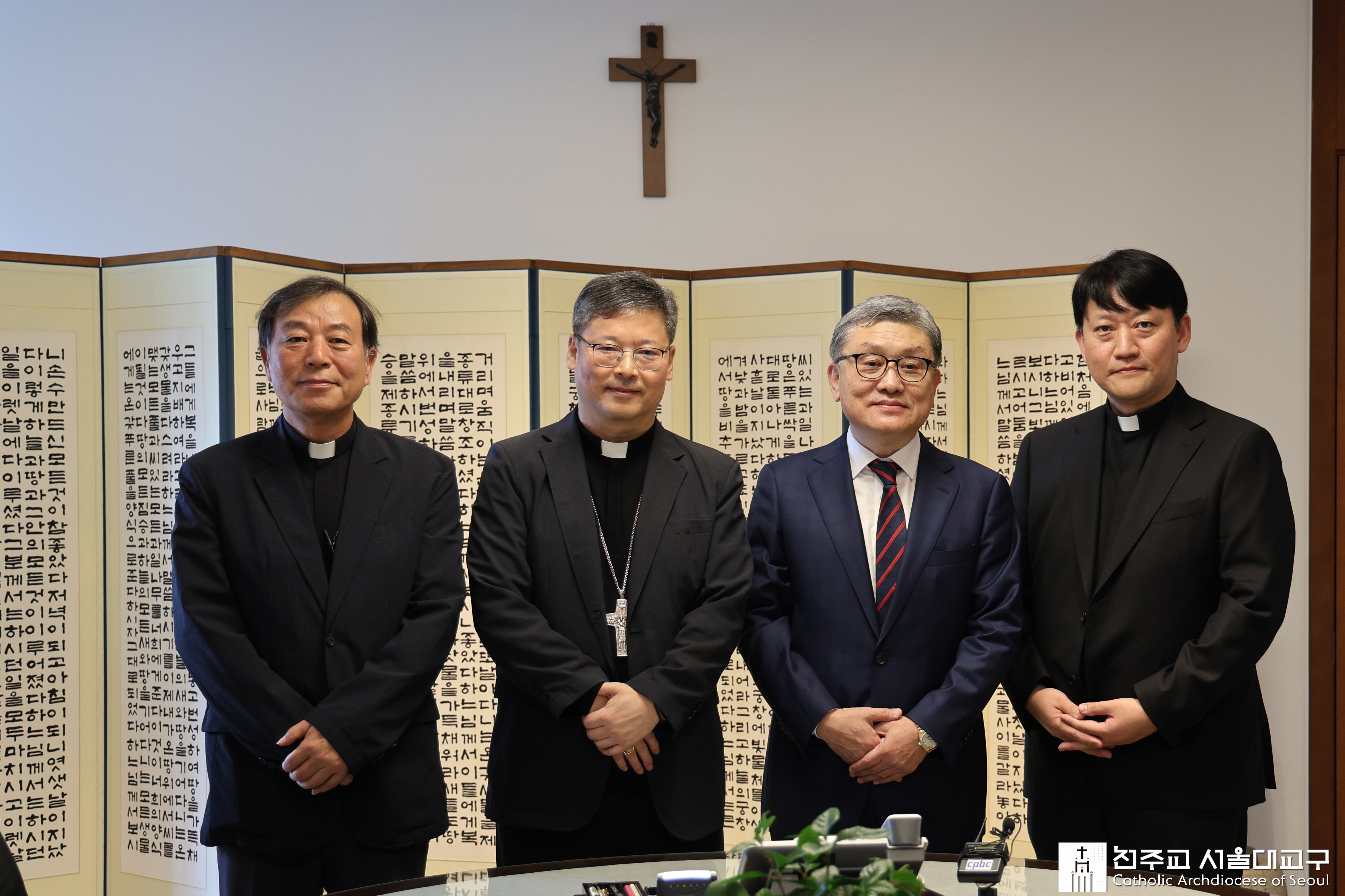 △ 천주교 서울대교구장 정순택 대주교가 31일 신형식 주교황청대사를 만나 기념 촬영을 하고 있다. 왼쪽부터 천주교 서울대교구 사무처장 정성환 신부, 정순택 대주교, 신형식
