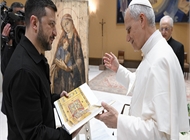 레오 14세 교황이 18일 바티칸에서 볼로디미르 젤렌스키 우크라이나 대통령으로부터 포탄 상자에 그려진 성화와 책을 선물받고 있다. OSV 바티칸이 세계 평화의 무대가