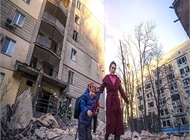 우크라이나 여성이 2022년 3월 16일 키이우에서 러시아의 공습으로 파괴된 건물에서 아이를 데리고 대피하고 있다. OSV 러시아-우크라이나 전쟁 갈등이 최고조로 치닫는