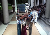 태국 교회·한국 교회 사제단과 청년들이 WYD 십자가를 함께 들고 입당하고 있다. 세계청년대회(World Youth Day, WYD) 상징물인WYD 십자가