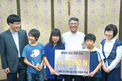 초등부 학생 3명과 강희재 주임신부는 5월 26일 수원교구청을 찾아 "수원교구 사제들이 선교활동을 하고 있는 남수단 지역 아이들을 위해 써 달라"며 교구 총대리 이성효 주교에게 성금을 전달했다.