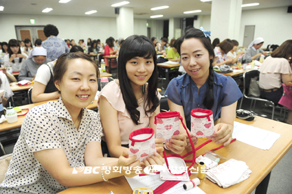 ▲ 유아 생태 월례강좌에 참석한 교계 유치원 교사들이 유아용 손수건 지갑을 만들어 보여주고 있다.