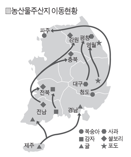 제주도 특산물로 유명한 감귤은 전남(25㏊)과 경남(9㏊)지역 비닐하우스에서도 재배할 수 있게 됐다. 복숭아는 전남과 경남, 제주지역의 재배면적 비율이 1982년 19.3에서 올해 5.7로 급감한 반면, 경기도 파주에서는 재배지가 늘고 있는 것으로 조사됐다. 무화과도 예외는 아니어서 전남 영암이 주산지였으나 북쪽인 충북 충주에서도 재배되고 있다. 포도 역시 경북지역에서 고성 등으로 북상한 지 오래다.