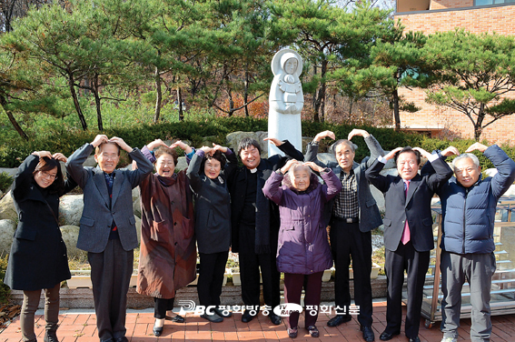 고봉연 신부(가운데)와 천사로 선정된 신자들이 팔로 하트 모양을 만들며 활짝 웃고 있다.