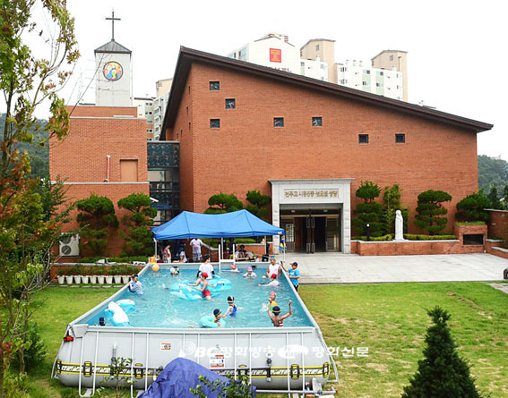 서울시 금천구 시흥동 시흥5동성당(주임 정동훈 신부). 아파트 단지와 나무로 둘러싸인 성당 마당에 큰 이동식 수영장이 설치됐다. 본당 주일학교 어린이를 비롯한 인근 아파트에 사는 어린이들이 물장난을 치며 즐거운 시간을 보내느라 여념이 없다.