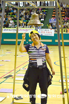 ▲ 개인전에서 최종 우승한 박윤자씨가 골든벨을 울리고 있다.