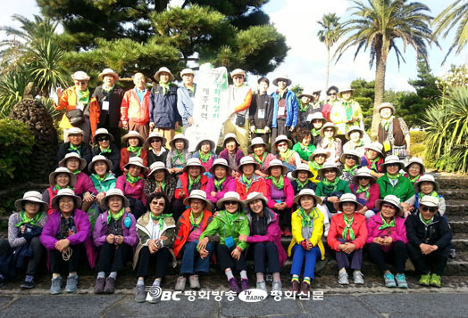 ▲ 서울 불광동본당 `우하하성지순례단` 단원들이 지난 10월 제주도 성지순례 중 환히 웃으며 기념촬영을 하고 있다. 사진제공=우하하성지순례단