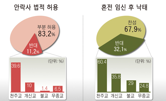 혼전 임신 후 낙태에 관한 견해를 묻는 질문에는 전체의 32.1가 “생명존중을 위해 낙태하지 않겠다”고 밝혔다. 천주교 학생의 60.4가 낙태하지 않겠다고 답했고, 개신교(35.8), 불교(29), 무종교(24.8)가 뒤를 이었다.