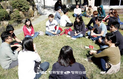 ▲ 4일 신한열 수사가 진행하는 떼제 기도 하루 피정에 참가한 이웃종교 젊은이들이 용서를 주제로 나눔을 하고 있다. 이정훈 기자 |
