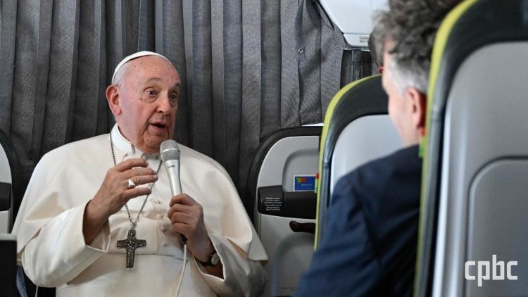 프란치스코 교황이 리스본에서 로마로 돌아가는 기내에서 기자회견을 하고 있다. (바티칸 미디어)